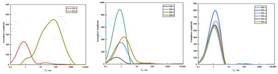 where T2 is the total transverse NMR relaxation time; T2B, T2D, and T2S are the bulk, diffusion, and surface relaxation time, respectively. The T2 spectrums of the investigated sample are presented in Figure 3, which depicts the full spectrum pore distributions of the investigated samples. It can be found that the T2 spectra of all the numbered samples exhibit a single peak distribution, with significant differences in the positions and scales of the peaks. The peak of SS-1 is located at 1 ms, with the prominent peak distributed at 0.1–10 ms, while the peak of SS-2 occurs at 100 ms, with the prominent peak ranging from 1 to 1000 ms. It indicates that SS-1 consists mainly of micropores with a comparatively low pore content, whereas SS-2 predominantly comprises mesopores with an extensive pore size distribution. The peak of the clay rock samples generally appears at 1 ms, with the primary peak distributed between 0.1 and 10 ms, indicating that the clay rock samples consist primarily of micropores. The pore size distribution of the mudstone samples is comparable, as well as the micropore content of the mudstone samples is typically greater than that of the shale samples. Among the shale samples, SH-1 has the highest micropore contents within the range of 0.1–10 ms, whereas the other three samples have comparatively low micropore contents, with a small number of pores greater than 10 ms.