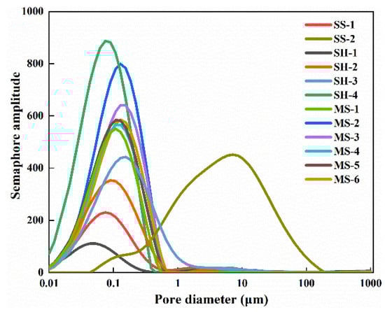 Pore structure features, i.e., total pore area and average pore diameter determined by MIP tests, are listed in Table 3. The results show that total pore areas are in the range of 1.20 m2/g (SS-2) to 12.17 m2/g (SH-4), and the average pore diameters range from 6.7 nm (MS-1) to 230.40 nm (SS-2). The sandstone samples have lower total pore areas with higher average pore diameters than clay rock samples. The average pore diameter of SS-2 is significantly higher than that of the other rock samples, indicating it has stronger pore volumes.
