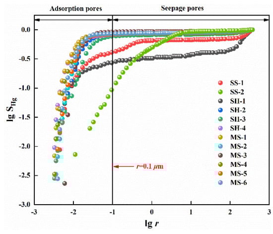Figure 5 shows the double logarithmic relationship of all rock samples between r and SHg, in which an apparent difference exists in the tangent slope between the two sides of the experimental sample at r = 0.1 μm. Hence, the curves are divided into two parts, and the multifractal dimensions of the adsorption pore (r < 0.1 μm) and seepage pore (r ≥ 0.1 μm) are calculated. Table 5 shows the correlation effect of multifractal dimensions and that the average correlation coefficients of the adsorption pore and seepage pore are 0.843 and 0.871, respectively. The relationship between DMIP is DA < Df < DS, which has prominent multifractal characteristics. The values of DA (r < 0.1 μm) range from 2.045 (SH-3) to 2.540 (SH-1), with an average of 2.274. Meanwhile, those of DS (r ≥ 0.1 μm) are between 2.877 (SH-1) and 2.907 (SH-2), with an average of 2.933.