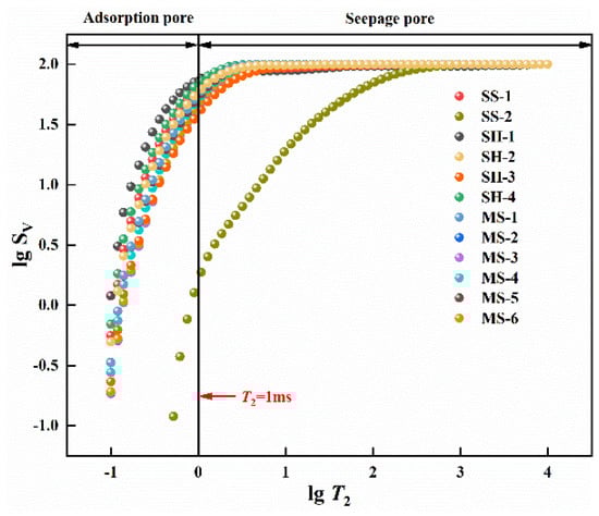 As shown in Figure 6, the double logarithmic relationship of all rock samples between T2 and SV, in which an apparent difference exists in the tangent slope between the two sides of the experimental sample at T2 = 1 ms. Hence, the pore size is divided into two parts: T2 < 1 ms and T2 ≥ 1 ms, and the multifractal dimensions of the adsorption pore (T2 < 1 ms) and seepage pore (T2 ≥ 1 ms) are calculated, respectively.