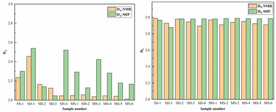 A comparison of the calculated results of DMIP and DNMR is shown in Figure 7. As mentioned above, both DMIP and DNMR exhibit obvious multifractal characteristics, in which the DA is substantially lower than DS, demonstrating great homogeneity of adsorption pores. The results of DMIP and DNMR are comparable when calculating the fractal dimension of seepage pores, although the DA estimated by the MIP experiment is typically higher than that determined by the NMR experiment. This may be due to the principle of MIP experiments. The measuring aperture and mercury injection pressure in MIP testing are inversely related. The mercury injection pressure used to evaluate the seepage pores is minimal and will not cause damage to the pore structure. However, the pore size of the adsorption pore is typically tiny, and the mercury injection pressure required for measurement is significant. The pore structure will be harmed by the excessive mercury injection pressure, and the pore structure’s increased heterogeneity will lead to measurement inaccuracies. The NMR experiment has the characteristic of being non-destructive, so the results are fairly precise when determining the adsorption pore’s size.