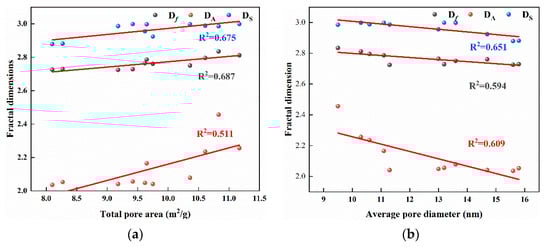 Correlations between (a) total pore area, (b) average pore diameter, and multifractal dimensions.