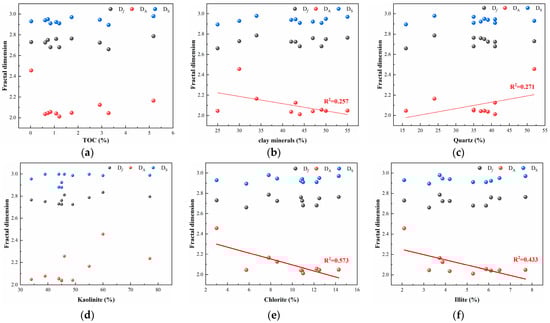 Correlations between the content of (a) TOC content, (b) clay minerals, (c) quartz, (d) kaolinite, (e) chlorite, (f) illite, and multifractal dimensions.