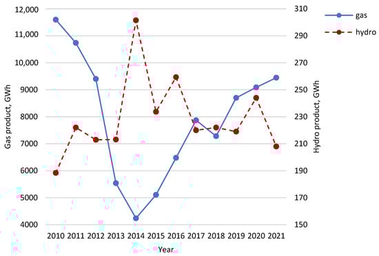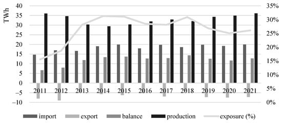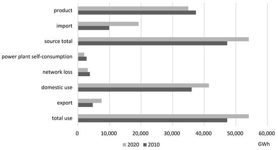 Hungary’s gross electricity production was 37,371 GWh in 2010, which decreased to 34,930 GWh by 2020, which represents a 6.53% drop. Another source of electricity is imported, which increased significantly from 9897 GWh to 19,176 GWh between 2010 and 2020. One of the reasons for growing imports is that Hungary can buy electricity cheaply from neighboring states. Including imports, total electricity sources increased from 47,268 GWh to 54,106 GWh during the term. Hungarian gross electricity consumption—including network losses and self-consumption—was 42,566 GWh in 2010, which increased to 46,607 GWh by 2020, which means an increase of 9.49%. In addition to domestic electricity consumption, exports increased from 4702 GWh to 7499 GWh (Figure 1). Despite the decreasing production, the increasing electricity consumption can be explained by the significant increase in net imports. In 2010, the country’s net import of electricity compared to its gross consumption was 12.2% (5195 GWh), and by 2020 it reached 25.5% (11,677 GWh), but it was more than 30% in 2014 and 2015 [74].