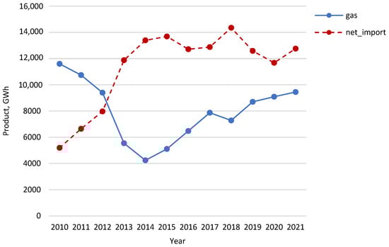 We used a time series analysis to present the composition of incoming and outgoing electricity. During the development of the gross electricity peak, the time series analysis also included the regression analysis of electricity consumption. Correlation analysis was used to examine the magnitude and direction of the pairwise linear association between the individual energy carriers for the period between 2010 and 2020. In the correlation analysis, we estimated the correlation coefficient of two samples using Pearson’s correlation coefficient. The r is the correlation value between the two investigated variables. The n = 12 value is the number of years taken into account (2010–2021). The correlation coefficient “r” of the samples ranges from −1 to 1. The “r” value quantifies the direction and strength of the linear association between samples.