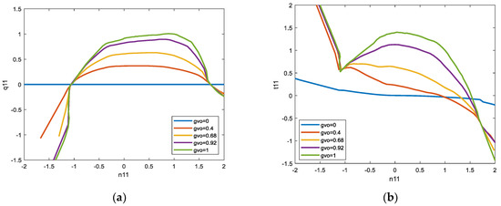 Hill chart of a Francis pump-turbine for different guide vane opening (gvo) positions; (a) unit flow(q11) and unit speed(n11); (b) unit torque(t11) and unit speed(n11).