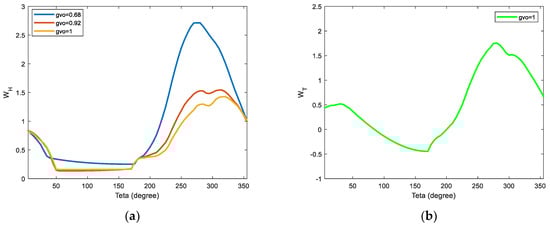 The polar format related to the Hill charts in Figure 2 for different guide vane opening (gvo) positions; (a) pressure head (Wh(θ)); (b) torque (Wt(θ)).