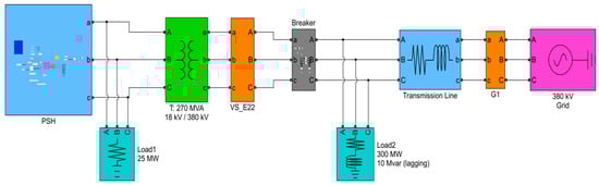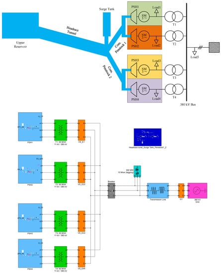 Every single Francis pump-turbine is connected to a salient pole synchronous machine with 65 MVA rated power and an 11 kV nominal line-to-line voltage. Each synchronous machine is connected to a load with 10 MW power and an 11 kV/380 kV power transformer. The HV side of all 4 power transformers (T1–T4) are connected on the busbar as depicted in Figure 12. Load 5 is connected to the coupling busbar of the hydropower plant and the power plant is connected to the 380 kV ideal grid with a transmission line. The properties of the studied system are presented in Table 1.