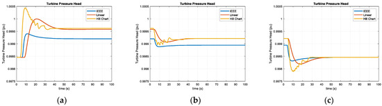 The reproduced results from [20]; (a) RTDS results for turbine pressure head changes due to a 0.15 pu decrease in the power setpoint for different turbine models; (b) RTDS results for turbine pressure head changes due to a 0.05 pu increase in the power setpoint for different turbine models; (c) RTDS results for turbine pressure head changes due to a 0.1 pu increase in the power setpoint for different turbine models.