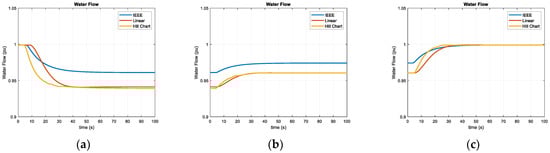 The results reproduced from [20]: (a) RTDS results for water flow changes due to a 0.15 pu decrease in the power setpoint for different turbine models; (b) RTDS results for water flow changes due to a 0.05 pu increase in the power setpoint for different turbine models; (c) RTDS results for water flow changes due to a 0.1 pu increase in the power setpoint for different turbine models.