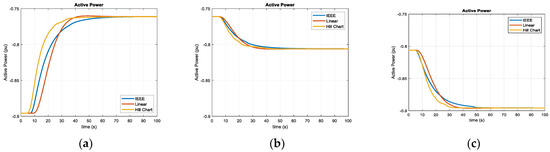 The results reproduced from [20]: (a) RTDS results for synchronous machine active power changes due to a 0.15 pu decrease in the power setpoint for different turbine models; (b) RTDS results for synchronous machine active power changes due to a 0.05 pu increase in the power setpoint for different turbine models; (c) RTDS results for synchronous machine active power changes due to a 0.1 pu increase in the power setpoint for different turbine models.