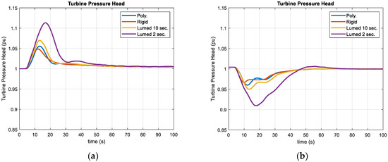 The results reproduced from [16]: (a) RTDS results for turbine pressure head changes due to a 0.5 pu decrease in the power setpoint for different waterway models; (b) RTDS results for turbine pressure head changes due to a 0.5 pu increase in the power setpoint for different waterway models.