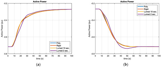 The results reproduced from [16]: (a) RTDS results for synchronous machine active powers due to a 0.5 pu decrease in the power setpoint for different waterway models; (b) RTDS results for synchronous machine active powers due to a 0.5 pu increase in the power setpoint for different waterway models.