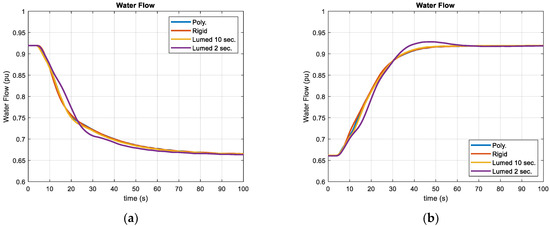 The results reproduced from [16]: (a) RTDS results for the water flow in the penstock due to a 0.5 pu decrease in the power setpoint for different waterway models; (b) RTDS results for water flow in the penstock due to a 0.5 pu increase in the power setpoint for different waterway models.