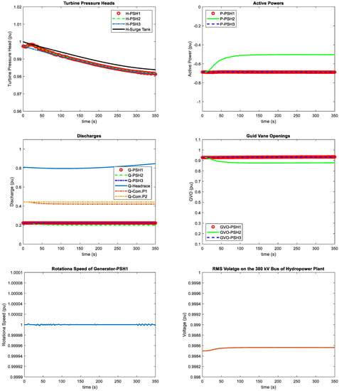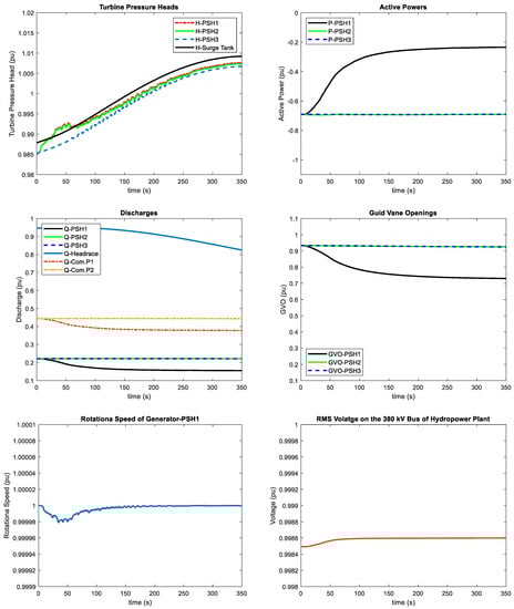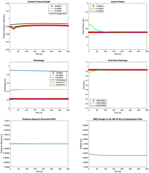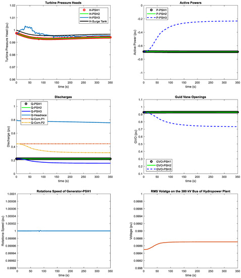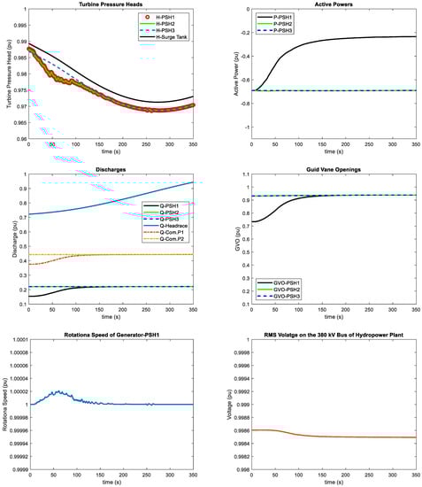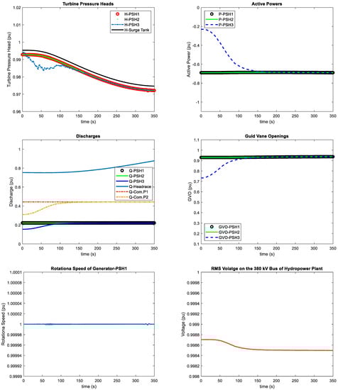 Figure 13 presents the RTDS results for decreasing the power set-point of PSH1 by 0.5 pu and the maximum rate of change as ±0.01 pu/s, while the power set-points of the other three units stay unchanged. By decreasing the power set-point of PSH1, its governor reacts and starts closing the guide vanes and this leads to a decrease in the discharge of PSH1 and consequently in the common penstock 1 discharge. In addition, changing the guide vane openings causes transient behavior in the pressure head. Since PSH1 and PSH2 are connected to the common penstock 1 with short separated penstocks, variations in the head and discharge in one unit can affect another one, e.g., there is head fluctuation in PSH2 due to the common penstock 1.