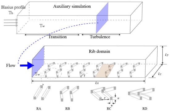 The impact of the rib angle upon turbulence and heat transfer performance is examined, based on global properties and first-order statistics. Next, the characteristics of turbulent momentum and heat transfer are discussed in detail by analyzing the shear stress and heat flux in the cross-sectional plane and decomposing the drag coefficient and Stanton number. Finally, the Reynolds analogy is analyzed to evaluate the heat augmentation performance of different surface regions.