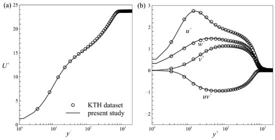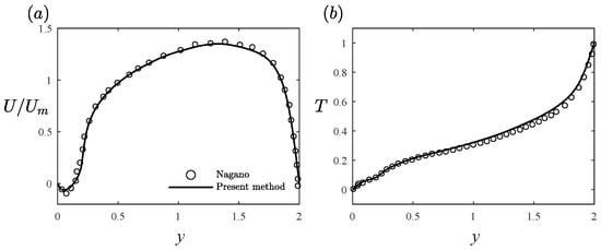 Figure 9 presents a comparison of the mean streamwise velocity and temperature in the