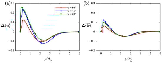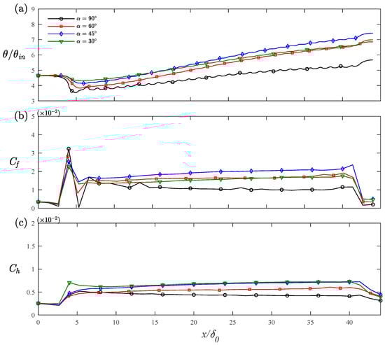 Figure 4. Compared to the transverse rib case, all quantities in the V-shaped rib cases substantially increased. The growth rate of momentum thickness increased and then decreased when the rib angle became smaller. A similar trend was also observed for