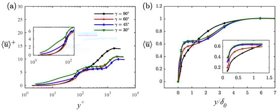 , and showed evident downward shifts, known as momentum defects, due to hindrance from the rough elements. Under the crest of ribs, the maximal streamwise velocity occurred in RD as the rib obstruction reduced with decreasing rib angle. Close above the crest of the ribs,