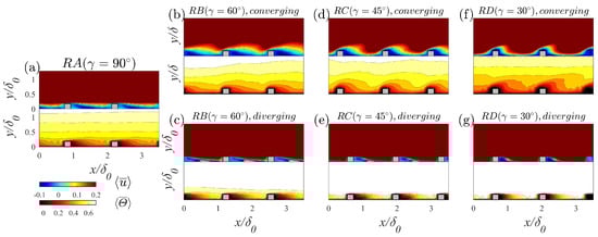 Figure 17c,e,g, gradually became close to the “smooth wall line” as the rib angle decreased, indicating higher heat transfer efficiency. RD showed the best heat transfer efficiency in the diverging region, due to its greatest heat transfer gain.