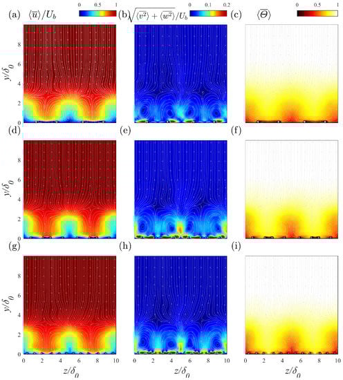 Contours of time-averaged normalized streamwise velocity, normalized strength of the secondary flow, and dimensionless temperature in the cross-stream plane, superimposed with the streamlines of secondary flows, are plotted in