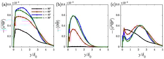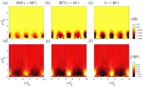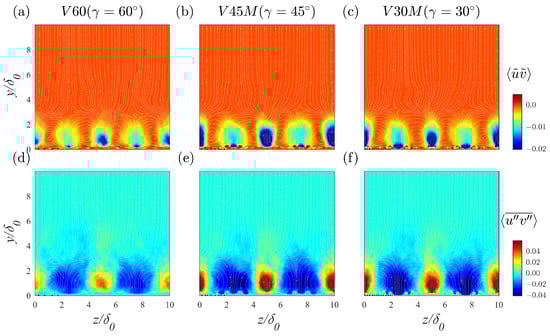 Figure 11c, showed double peaks, including an inner and an outer peak. The inner peak occurred in the vicinity of the rib crest, while the outer peak was further away from the wall. The emergence of double peaks resulted from turbulent shear stress with opposite signs forming above the diverging and converging regions. In the second row, the negative turbulent shear stress played a dominant role under the rib crest, while more positive spots appeared in the adjacent two sides of the ribs as the rib angle decreased, consistent with the decreasing inner peak values shown in