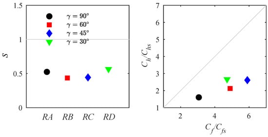Figure 16. According to the definition, a surface transports heat from wall to fluid more efficiently when s is large. Therefore, in the present study, the largest Reynolds analogy was obtained in RD, indicating that, among the angled ribs researched, ribs with