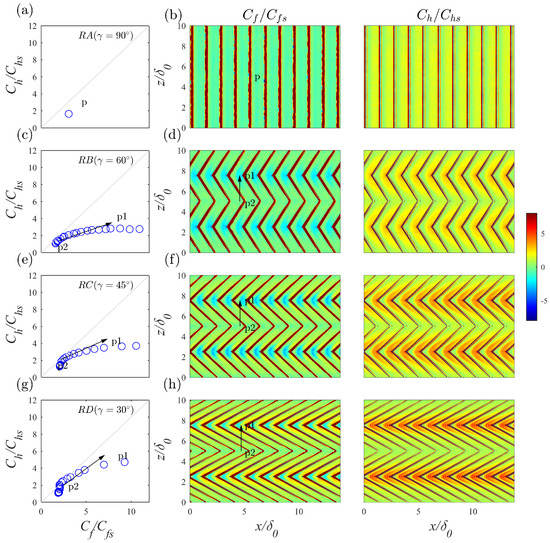 In the transition region, which ranged from point to , many points were distributed near the “smooth wall line” for all V-shaped rib cases, indicating enhancement in heat transfer efficiency in this region. This was mainly due to the fact that decreased faster than from to , in other words, from the diverging region to the converging region, for the V-shaped rib cases. This trend was more pronounced at smaller angles. When decreased to around 5, the points were densely distributed near the line in RD, indicating a relatively high heat transfer efficiency region near . However, in this region, both and were low and showed less effect on total shear stress and heat flux.