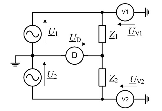 In the unbalanced digital impedance bridge (Figure 1), by means of which elements with impedances Z1 and Z2 are compared, a state close to equilibrium is achieved by adjusting the amplitude and phase of voltages U1 and U2 generated by digital sources of sinusoidal voltages. The system measures the unbalanced voltage UD with the use of the zero indicator D and the voltage ratio U1/U2 with the use of an appropriate measuring circuit that enables the measurement of the complex voltage ratio; most often it is a multichannel sampling system usually called a digitizer. In Figure 1, this system is represented by voltmeters V1 and V2.
