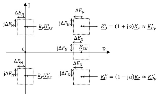 The procedure related to the selection of DVSS settings in the proposed interpolation method can be illustrated graphically. For this purpose, it is assumed that the nominal value of the ratio of the compared impedances KZN is known, which differs from the correct value KZ by a certain value of the error of the real part ΔEN and the imaginary part ΔFN (cf. (16)), which can be expressed by the relation: