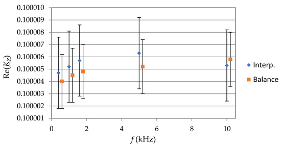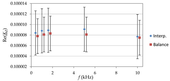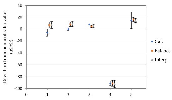 Table 3 shows the values of the real part Re and the imaginary part Im of the ratio of the compared impedances KZ determined from the measurements made using the interpolation method. For R-R comparisons, the component Re(KZ) refers to the ratio of the resistances of the compared standards, while the imaginary component Im(KZ) represents the phase angle equal to the difference of the arguments of the compared impedances. Similarly, in the case of C-C comparisons, the imaginary component represents the capacitance ratio, and the imaginary component the difference in phase angles of the compared capacitance standards. For the R-C comparison, the imaginary component refers to the dominant impedance components, while the imaginary component represents the difference of the residual components of the standards, i.e., the time constant of the resistance standard or the dielectric loss factor of the capacitance standard. In Table 3, there are also the differences Δbal. given between the experimentally determined real components Re(KZ) in the case of R-R and C-C comparisons and the imaginary Im(KZ) in the case of the R-C comparison in the interpolated bridge and the balanced bridge. Similarly, Δcal. means the differences between the above-mentioned impedance components determined using the interpolation method and the values determined on the basis of calibration certificates of impedance standards and the results of measurements made at the Polish NMI Central Office of Measures (GUM, Warsaw, Poland). Data from standards calibration certificates and data from measurements made at the GUM are referred to in the rest of this article as the data of standards calibration.