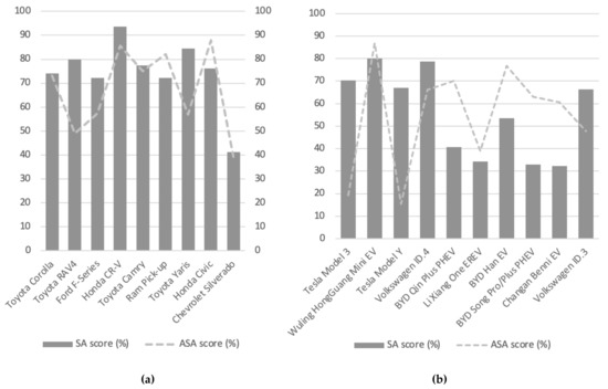 In the framework of the performed analyses, several connections have been identified that need to be discussed in the context of continuous reputation research. Specifically, this is a connection between the one-factor SA and two-factor ASA analysis for the reputation of selected entities, as well as the specificity in the form of the absence of evaluation by Reputators for some of the entities analyzed. The following figures present the analysis of these facts in the context of knowledge identified in reference analyzes [12,13,14]. Figure 4 shows the individual entities ranked based on sales and, subsequently, also their reputation characteristics in the form of simple and advanced sentiment analysis, especially for the ICEV and EV categories.