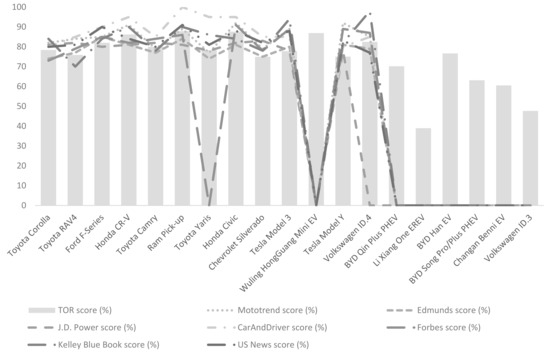 The vehicles BYD Qin Plus PHEV, Li Xiang One EREV, BYD Han EV, BYD Song Pro/Plus PHEV, Changan Benni EV, and Volkswagen ID.3 do not have any ratings on the monitored platforms. The implications of this condition will be described in the following sections of the study.