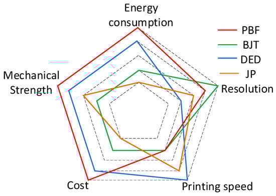 Figure 1 shows the overall comparison of the aforementioned techniques. Both PBF and BJT provide higher resolution, which is needed in most applications, but are limited by printing speed. Further, DED and Joule printing are faster while having a lower resolution. On the other hand, EBM and SLM are typically more expensive 3D printing methods that use high-power lasers to melt metal, ceramic, or polymer powders into solid objects. However, EBM and SLM can produce high-quality, high-density parts with high mechanical strength and fine resolution, making them suitable for applications where high performance is required.