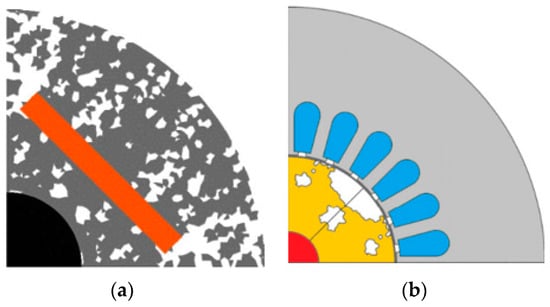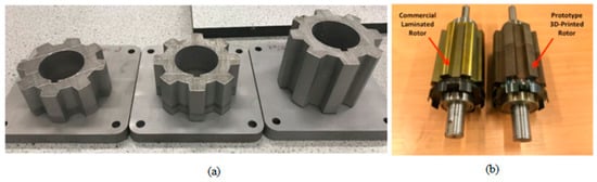With respect to the fabrication of magnetic parts and components, AM offers a compelling alternative to the well-established methods. The optimized switch reluctance machine rotor, which has six poles of the salient type, is shown in Figure 2a. This rotor was constructed using the PBF technique from an iron–cobalt alloy with a magnetic flux density of 2.3T. The authors also indicate that to decrease the specific power loss, the electrical resistivity of the developed design might be further enhanced [29]. Moreover, Figure 2b depicts the synchronous reluctance machine’s rotor, which was fabricated using the PBF AM approach [38].