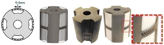 In order to lessen the torque ripples and windage loss, a novel skew rotor design for switched reluctance machines was proposed. It has 2 mm thick ribs with 0.4 mm diameter holes in a honeycomb structure as shown in Figure 4. Using the conventional process, it was challenging to construct this rotor design. The AM method of PBF is used to build the prototype for this rotor design. Additionally, the 45% decrease in the machine’s torque ripples profile was shown by the experimental results [41].
