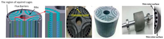 According to [46], a line start synchronous reluctance machine was designed with a novel, robust structure for less copper losses and vibration. As shown on the left side of Figure 7, the flux barriers include small ribs that go both in the xy and z directions to create a grid-like structure. Aluminum paste was placed within the cage of the line start synchronous reluctance machine, which was then heated to produce a solid aluminum cage as shown in Figure 7. The filling of the barriers lessens the machine’s vibration, but this impact also lowers the saliency ratio, which reduces the torque.