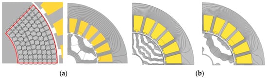 The material is configured to iron when the cell is in the on state, whereas it is configured to air when the cell is in the off state. Three different optimization problems were studied to improve the performance of the machine: (i) maximize torque; (ii) minimize iron losses with constraint of average torque; (iii) maximize average torque with constraint of iron losses. Furthermore, the Gaussian function distribution and the optimized design is shown in Figure 12a. There should be a tradeoff between the average torque and the iron losses because the wider rotor surface increases the torque, but also, the latter should be made smaller to reduce the iron losses. Another filtering technique, Gabor filter combined with ON–OFF method based on NGNet, is presented in [84]. The authors concluded that the proposed filter provided lower torque ripples as compared to the conventional NGNet, and the optimized design using filter gives the thinner flux barriers as depicted in Figure 12b. The main disadvantage of the abovementioned methods is the high computational cost because the FEA computation is needed at each generation [85].