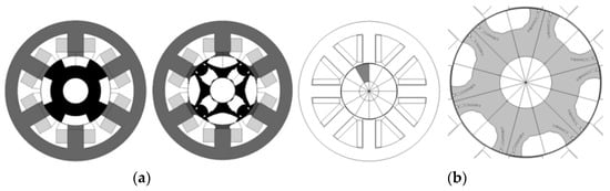where is the magnetic reluctivity and is a function of the mgnetic flux density and , is the reluctivity of the element and reluctivity of air, respectively. The penalization coefficient is represented by the variable By choosing the proper value of , the gray elements can be eliminated. In [102], the material density-based TO was utilized for the torque ripple minimization and the design space include the stator teeth and rotor poles. The optimized design showed a significant amount of reduction in the profile of torque ripple with the cost of a slight reduction of 7.22% in the average torque. In addition, the initial and optimized design of 6/4 pole SRM is depicted in Figure 15a. The TO of material density was applied in [103] to minimize the torque ripple and the final design reach to the target torque value. The design space includes the half of the rotor pole as shown in Figure 15b, and after optimization, the torque reached the target value. The overview of TO applied to the reluctance machine for performance enhancement is shown in Table 3.