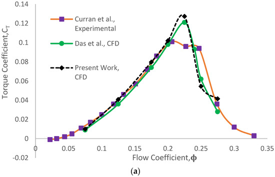 In the case of , the angle of attack (AOA) is relatively large. Consequently, deep stalling occurs due to the flow separation at the leading edge, rapidly dropping torque and efficiency. Due to the nature of RANS solvers, they are not very good at predicting adverse pressure gradient flow separations and often overestimate torques. As a result, numerical results become increasingly difficult to reconcile with experimental results at stalled flow conditions [5]. Despite this, the results of the present study are comparable to those obtained by other CFD [20,22,39] studies, given the same geometrical features.