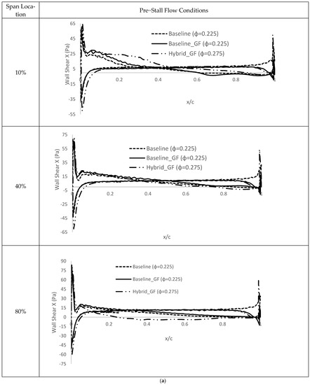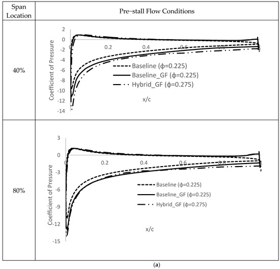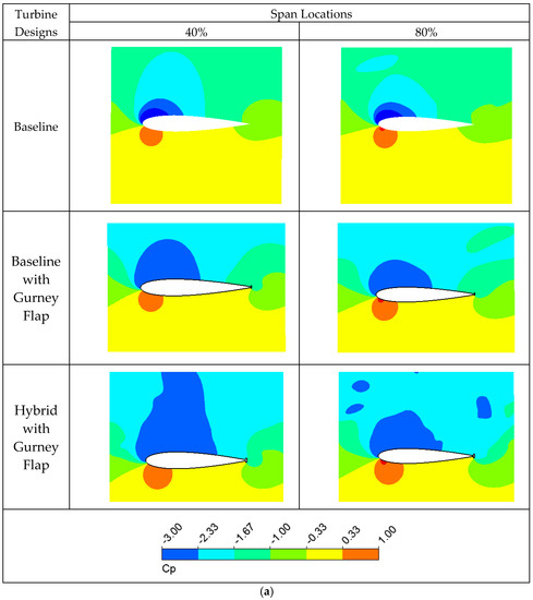 Moreover, the GF extended the operating range by ~3° AOA for the hybrid turbine. That means the hybrid turbine with GF stalled at , whereas the other designs experienced the stall at .
