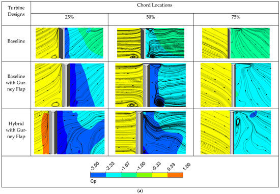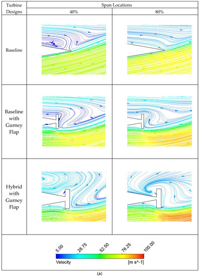 Once the numerical results had been validated, we simulated our new turbine designs for a range of flow coefficients, , or equivalently . We examine the two designs, one using GF attached to a baseline and the other using GF attached to a hybrid, and compare them with the other using constant chord (baseline), as illustrated in Figure 10.