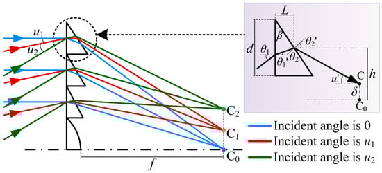 A Fresnel lens has a significant advantage in enhancing the receiver performance of light [28]. However, when the incident angle of echo light rays is not 0, it will affect the echo receiving power of the detector. The optical path of echo light rays with different incident angle is shown in Figure 1. u is the incident angle of echo light rays. u′ is the exiting angle of echo light rays. μ1 is the incident angle on the incident plane of the Fresnel lens. μ1′ is the refraction angle on the incident plane. μ2 is the incident angle on the exiting plane of the Fresnel lens. μ2′ is the refraction angle on the exiting plane. α is the vertex angle of the serrate prism. f is the focal length of the Fresnel lens. L is the horizontal distance between the exiting point and the incident plane. h is the vertical distance between the exiting point and the optical axis. δ is the deviation of the echo light ray convergence point. Additionally, n is the refractive index of the Fresnel lens.