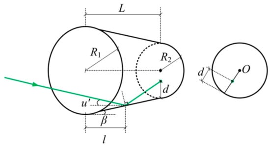 As shown in Figure 2, the incident aperture of the annular condenser cell is R1, the exit aperture is R2, the length is L, the reflecting surface inclination is tan β, the angle between the echo light ray and the optical axis is u′, the horizontal distance between the reflection point and the incident port is l, and the distance from the falling point of the outgoing light to the photosensitive surface of detector along the radial direction to the edge of photosensitive surface is d, which can be obtained from the geometric relationship: