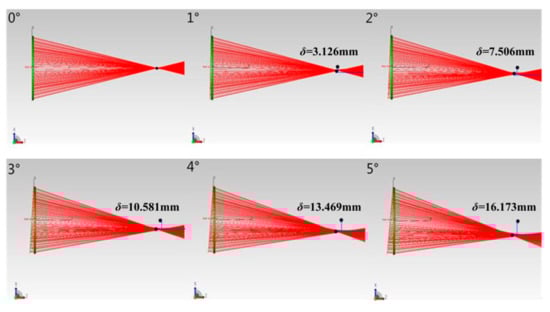 The modeling and simulation of the Fresnel lens was implemented in TracePro software, and its specific parameters are shown in Table 1. As shown in Figure 3, the incident light rays from 0° to 5° were traced, and the deviation of the convergence point is marked. As the incident light gradually deviates from the optical axis of the Fresnel lens, the focal shift along the X-axis direction (i.e., the radial direction of the Fresnel lens) increases proportionally with the change of the incident angle, and the focal shift is about three times the incident angle, which is consistent with the analytical result of Equation (5).