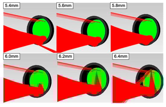 The principle is as follows: the optical receiving efficiency of the detector under angle-by-angle light ray is maximized, and a light ray that has entered the reflection cell cannot escape through secondary reflection. Considering the complexity and cost of the actual preparation process, the parabolic reflector part of COR is divided into the annular condenser cells with a length L1 of 2 mm, and the exit aperture is R2, 1 of the first-stage annular condenser cell is set to be 5 mm. When the incident angle of the echo light ray is 1.4°, the first-stage annular condenser cell model with incident apertures of 5.2, 5.4, 5.6, 5.8, 6.0, 6.2 and 6.4 mm is ray-traced, and the simulation results are shown in Figure 5.