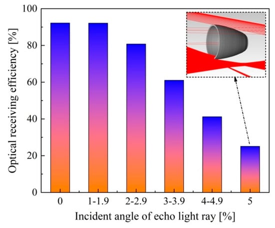 The structural parameters were input into MATLAB (R2018b) software for curve fitting to obtain the parabolic equation. The incident aperture of parabolic reflector part was 11.44 mm, the exit aperture was 5 mm, and the length was 24 mm. The optical receiving efficiency of the parabolic reflector part of COR is shown in Figure 6. The parabolic reflector part had good focusing performance for the echo light in the range of 0° to 2.9° of the incident angle. With the continuous increase in the incident angle, its focusing performance dropped sharply.