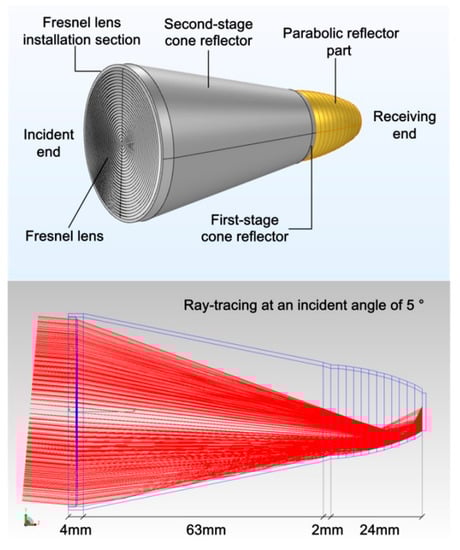 The complete optical structure of COR was obtained through optimization design as shown in Figure 9. COR was successively connected by the Fresnel lens installation section, the second-stage cone reflector, the first-stage cone reflector and the parabolic reflector. The Fresnel lens was located at the incident end. When the incident angle of the echo light rays were less 1.3°, the echo light rays were directly focused on the detector by the refraction of the Fresnel lens.