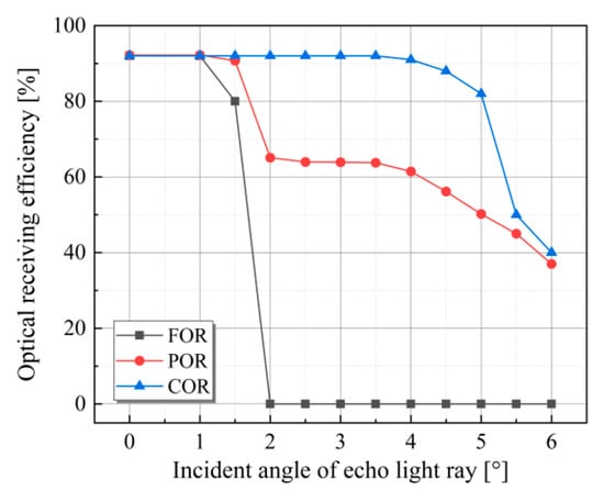 The simulation analysis of the echo light ray receiving performance was conducted, and the results are shown in Figure 10. When the incident angle of echo light ray was 0°, the optical receiving efficiencies of all three optical receivers were 92.2%. Thus, the Fresnel lens of these three optical receivers plays a direct focusing role when the echo light rays are parallel to the optical axis. As the incident angle increases gradually, the optical efficiency of these three optical receivers declines. COR was compared with FOR: the optical receiving efficiency of FOR was reduced to 0 when the incident angle was greater than 2°. Thus, the detector could not receive the echo light ray.