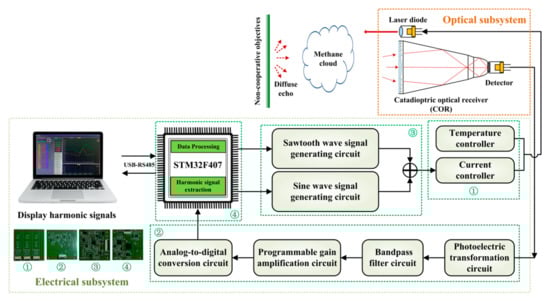 The schematic of the independently developed methane laser telemetry coupled with the COR system is shown in Figure 11. The sensor architecture mainly includes an optical subsystem and electrical subsystem. In the optical subsystem part, a single-mode continuous distributed feedback laser diode (EP-1653-DM, Eblana Photonics, Dublin, Ireland) using a TO39 package structure was employed as the laser sources with the wavelength ∼1653.7 nm (corresponding to the absorption features of methane), output power of 10 mW and optical linewidth of 2 MHz. A K9 Plano convex lens (100006, United Optical Technology (Beijing) Co., Ltd., Beijing, China) was involved to control the divergence angle of the laser beam and was installed on the optical lens mounts in front of the laser diode.